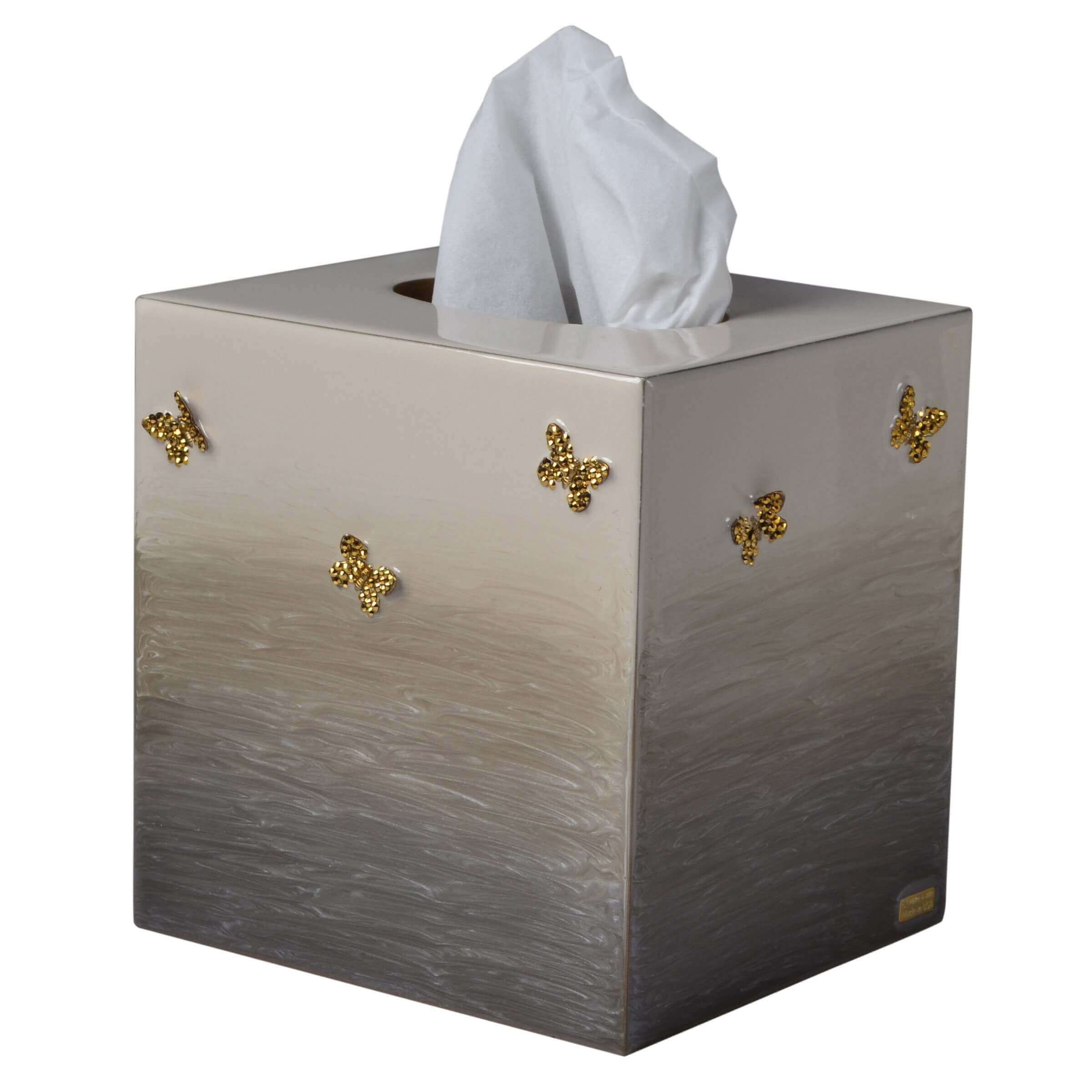Artisans have crafted a soothing ombre effect accented with exquisite pave butterflies for a refreshing bathroom accent, featuring a natural gradation of ecru, putty, and mocha with gold trim. Each piece is custom made in our NYC studio. Please allow 4-5 weeks.