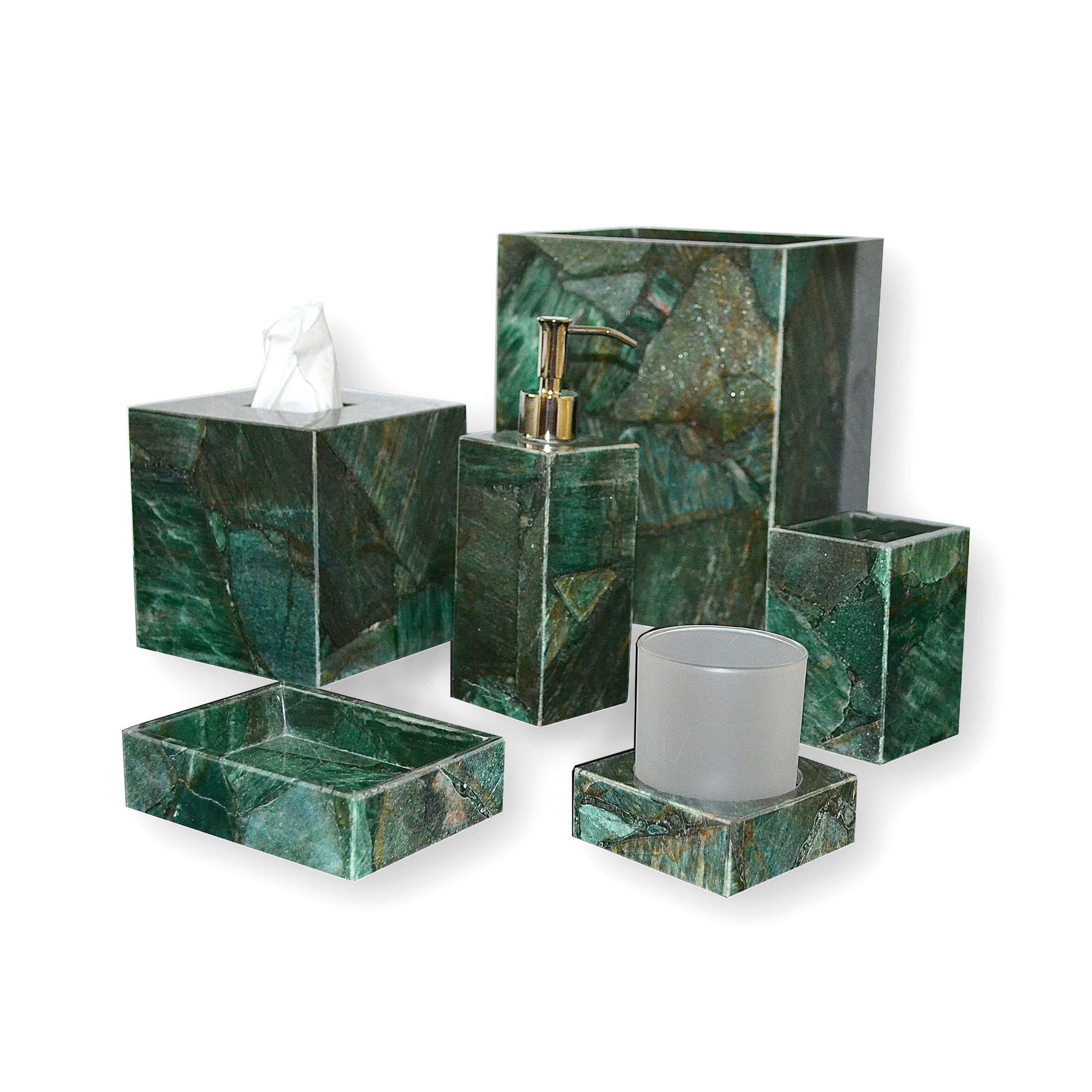 The epitome of luxury bath accessories. Nothing compares to the opulence and complexities of nature's rich Green Aventurine hues. This semi precious stone is mined in Madagascar and said to have the properties of luck and prosperity. Each piece is hand cut, crafted and polished. Please allow 4-5 weeks production.